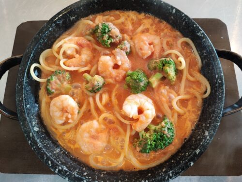 外の空気が少し冷たく感じられる季節、温かな石鍋で提供される「小エビとブロッコリーのトマトクリーム」はまさに心までほぐれる味わい。