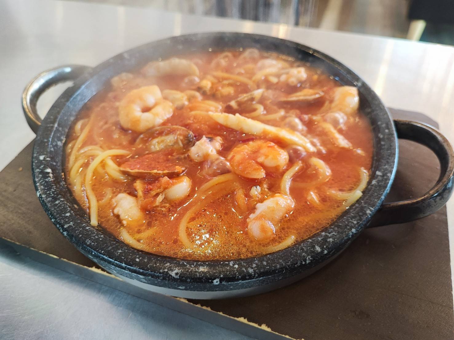 当店では弾力のある卵不使用の生パスタ(淡路麵業製)を使用。もちもちの麺がトマトソースをしっかり絡め取り、海鮮の旨みを一口ごとに感じられるのが魅力です。石鍋でグツグツと仕上げることで香りと温度が長持ちし、最後まで熱々でお楽しみいただけます。