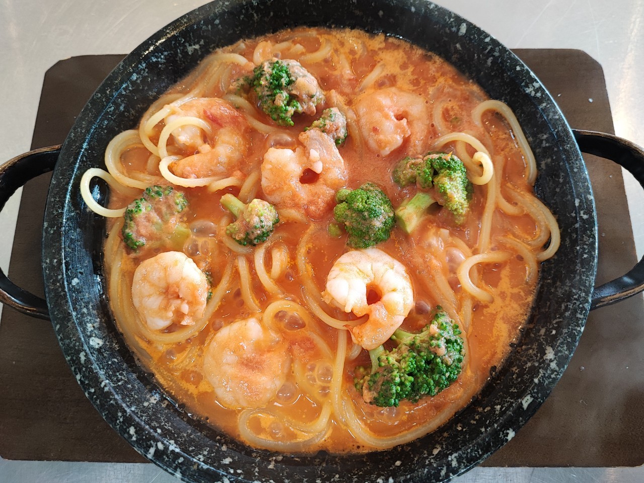 当店の生パスタは老舗製麺所が作るもちもち麺。茹で上がりの弾力がソースをしっかり抱き込み、口に入れた瞬間に小麦の香りとトマトクリームの旨みがふわっと広がります。そこへ石鍋の遠赤外線効果が加わり、ソースの香りが立って食欲を刺激。提供時には湯気とともに香りが広がり、視覚・嗅覚・味覚すべてで“できたて”の喜びを感じていただけます。